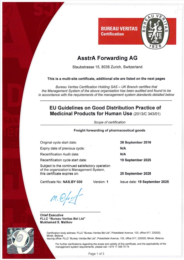 The certificate confirms compliance with EU guidelines on Good Distribution Practice (GDP). Certification was performed by Bureau Veritas, a global leader in the field of testing, inspection, and certification. Our certificate offers one more reason our customers can trust us to ship their medicines reliably. Our certificate demonstrates our commitment to using up-to-date control technologies and sharing shipment information with customers at all stages of cargo transportation.